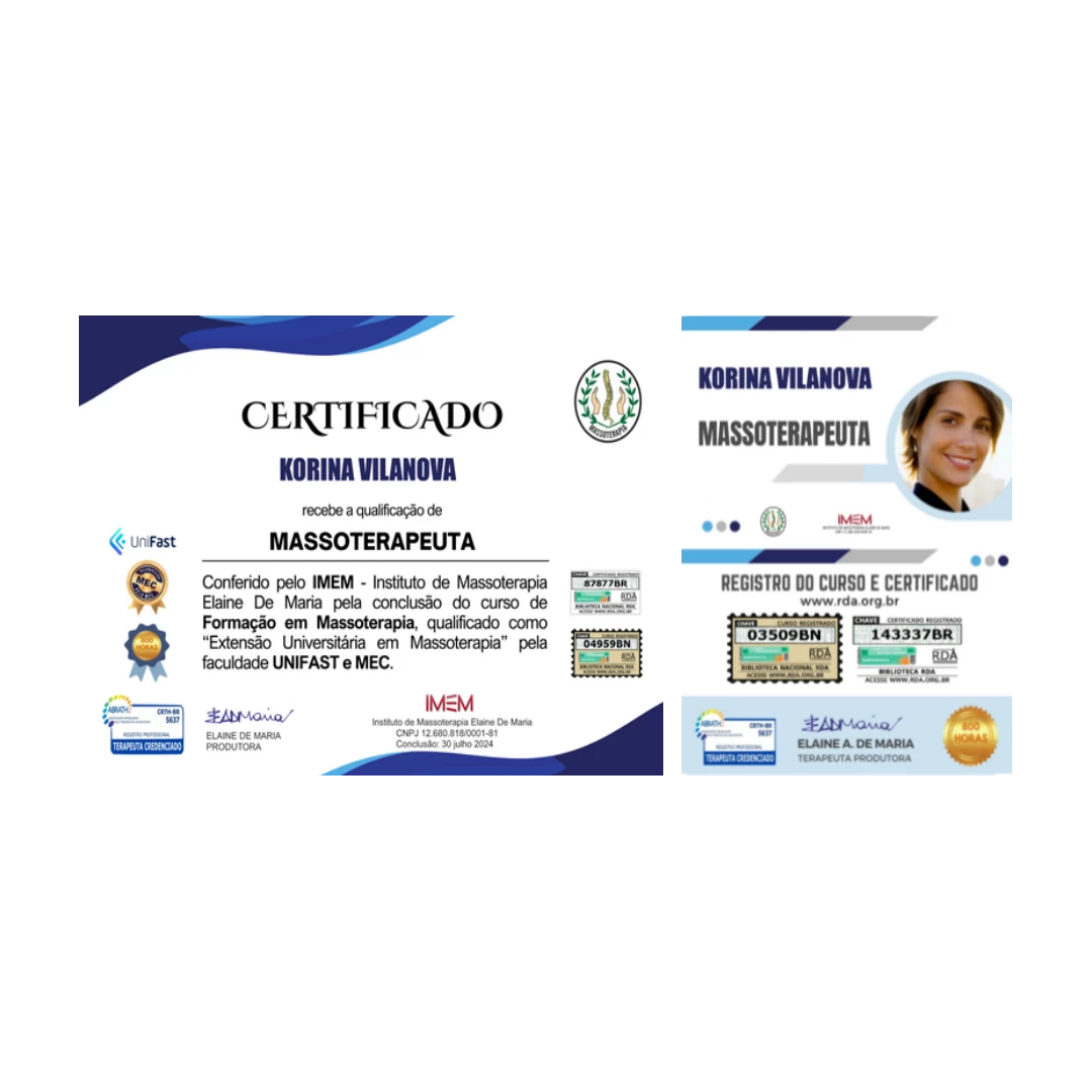 Certificado com registro ABRATH + carteirinha de massoterapeuta.