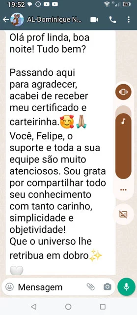 Formação orientada à prática, com estudo passo a passo e suporte contínuo para dúvidas. A escola destaca atendimento rápido e presente durante a jornada (via área do aluno) e diferenciais de certificação (registro ABRATH e carteirinha), além de credencial como Extensão Universitária pela instituição de ensino parceira, conforme comunicação oficial. Recomendamos confirmar, no ato da matrícula, carga horária, documentos emitidos e política de suporte.